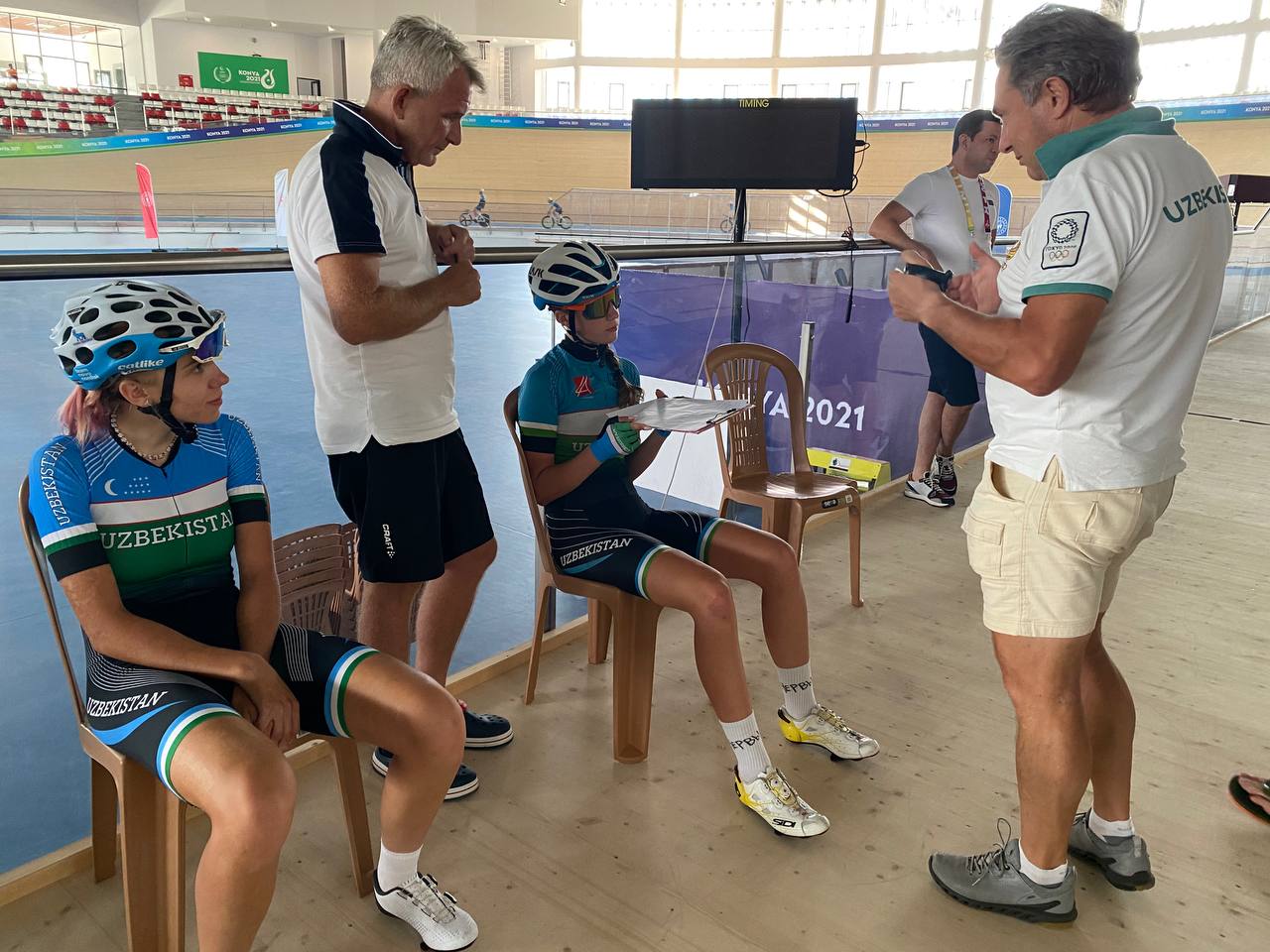Kunning ikkinchi yarmida MOQ raisi o‘rinbosari velotrek bazasida terma jamoamizning mashg‘ulotlarini kuzatdi. Jarayon davomida O‘zbekiston velosiped sporti federatsiyasi bosh kotibi Kozim O‘rinboyxo‘jayev hamda bosh murabbiy Gleb Groysman bilan sportchilarimizning tayyorgarligi, ruhiy va jismoniy holati haqida suhbatlashdi. Eslatib o‘tamiz, musobaqa doirasida dastlab velotrek bo‘yicha terma jamoamiz 5 avgustdan bahslarga kirishadi.