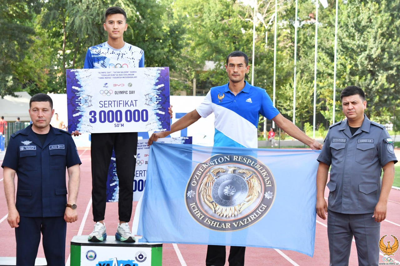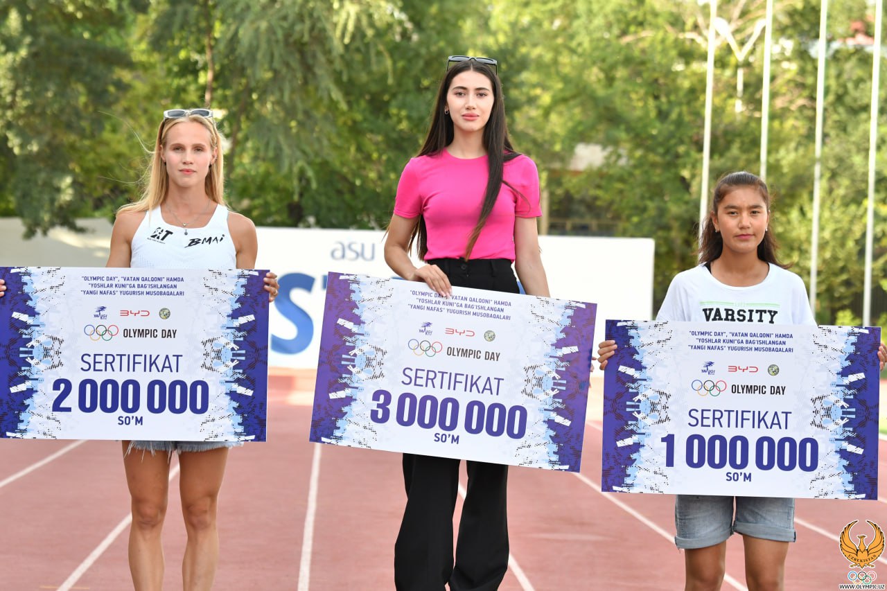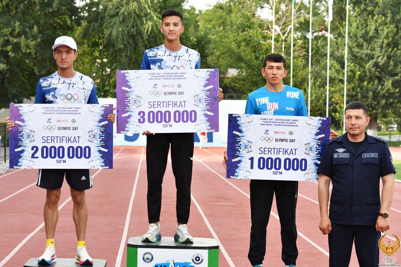 O’zbekiston yengil atletika federatsiyasida Xalqaro Olimpiya kuni, Bolalarni himoya qilish kuni va Yoshlar kuniga bagʻishlangan "BYD Yangi Nafas" ommaviy yugurish musobaqasining g’olib va sovrindorlarini taqdirlash marosimi bo’lib o’tdi. Unga ko’ra, 3 km masofaga kechgan poyda mutlaq yo’nalishda shohsupaga ko’tarilgan ishtirokchilar nomi quyidagicha ko’rinish oldi: