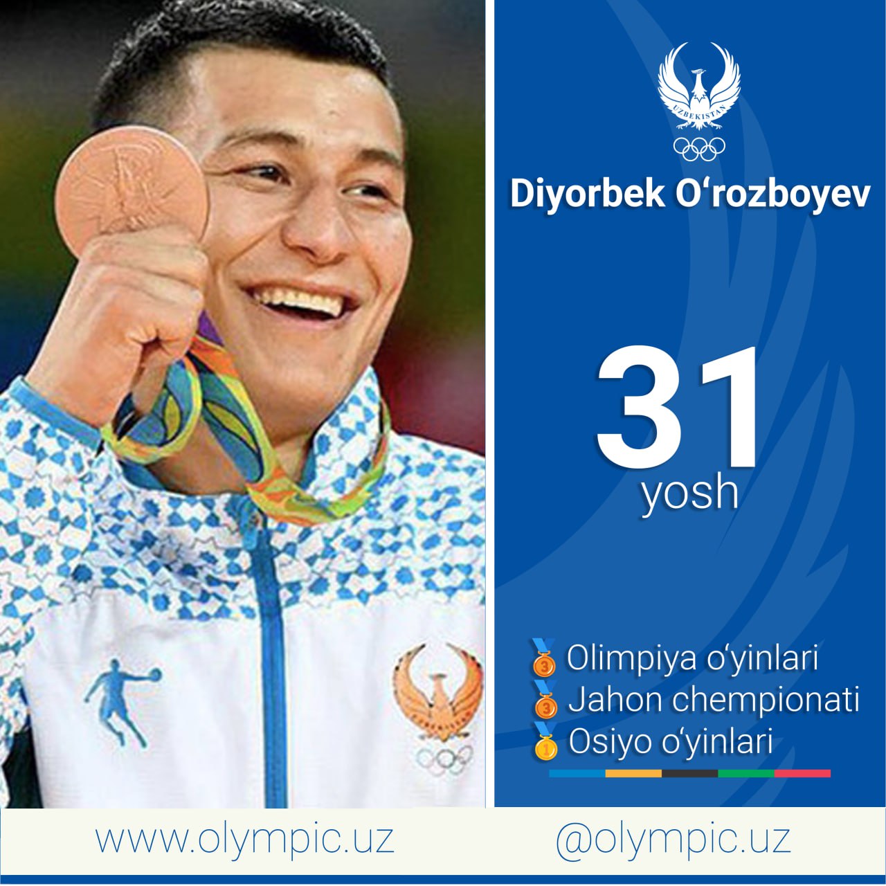 Bugun dzyudo boʻyicha Rio-2016 yozgi Olimpiya oʻyinlari va jahon chempionatining bronza medali sohib...