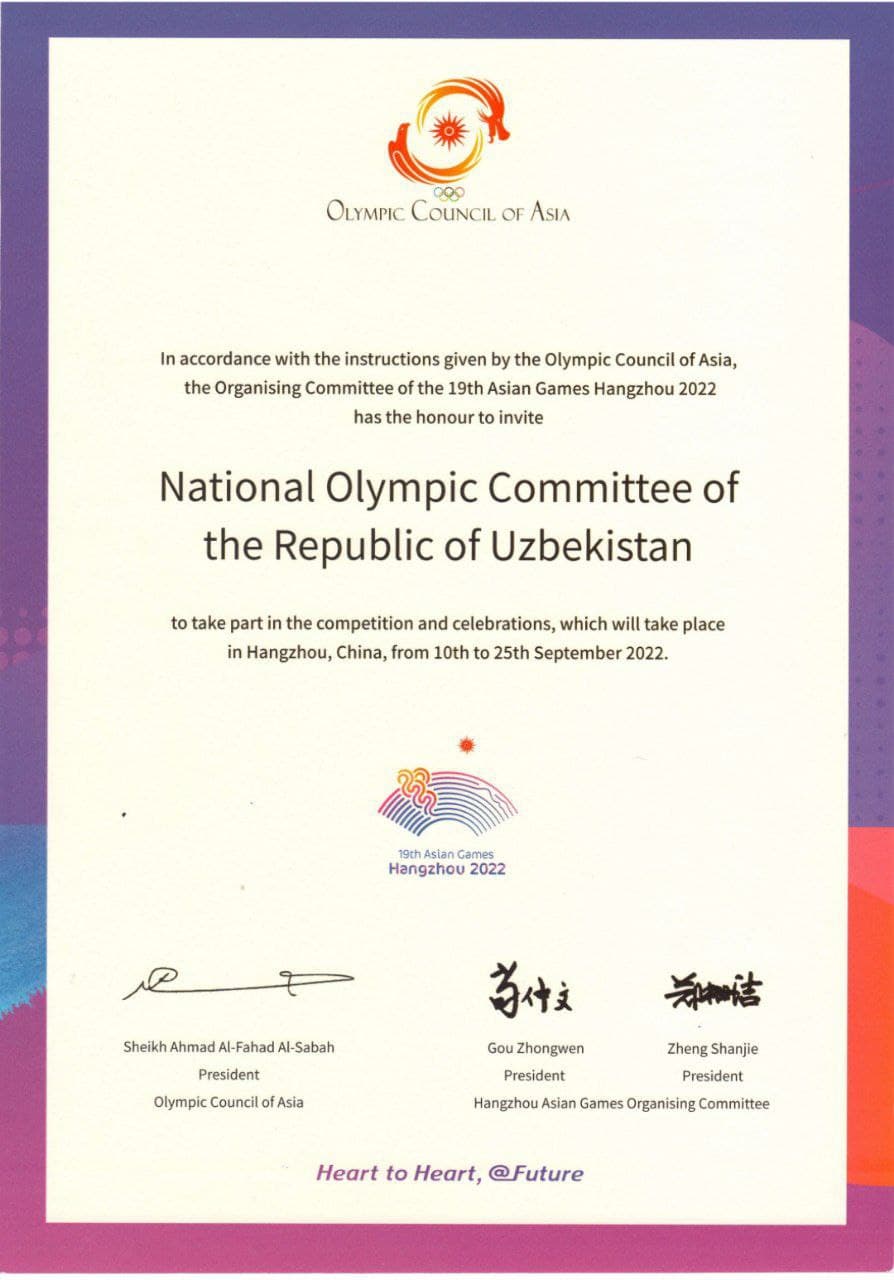 Несомненно, одним из главных соревнований в 2022 году для узбекского спорта являются XIX Азиатские игры в Ханчжоу (Китай). Оргкомитет направил в НОК официальное приглашение для участия в этом крупном спортивном мероприятии.