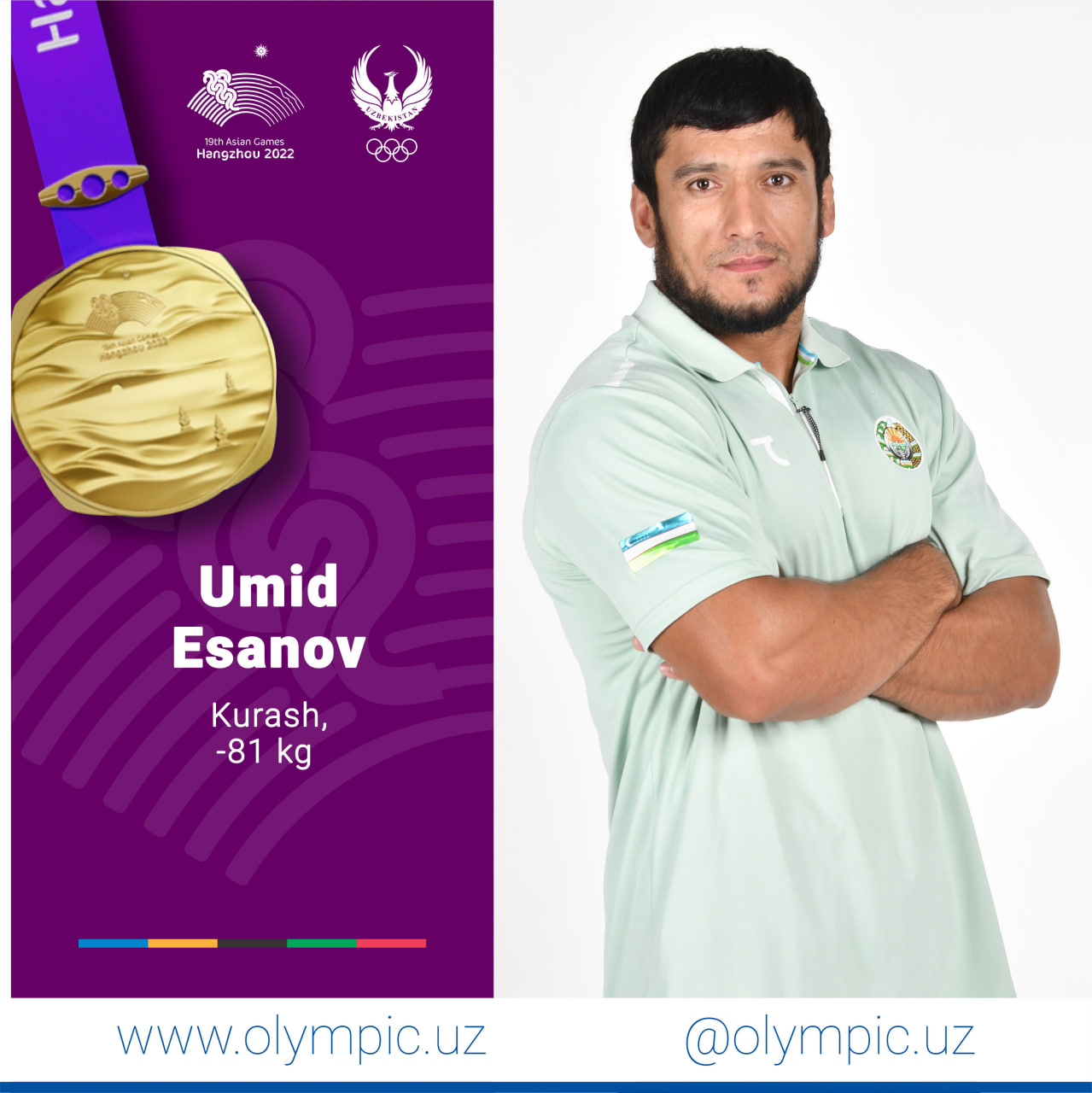 Член сборной Узбекистана по курашу Умид Эсанов пополнил копилку делегации нашей страны ещё одной золотой медалью. Наш соотечественник, выступавший в весовой категории до 81 кг, в финале одолел казахстанца Бекадила Шаймберденева и стал чемпионом Азиатских игр.