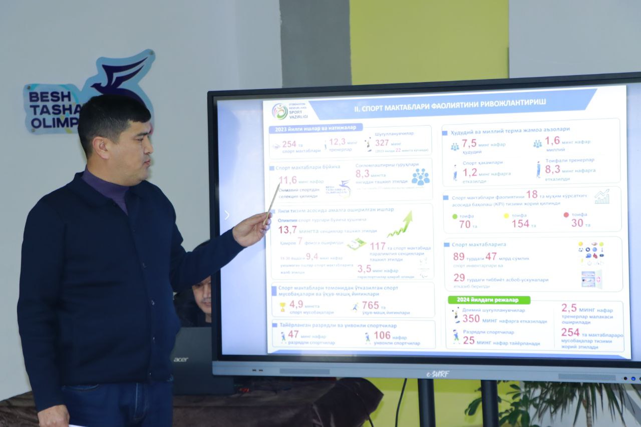 Также была изучена деятельность спортивного комплекса "Алпомиш", и созданные условия для атлетов в специализированных спортивных школ по водным видам спорта, гимнастике, единоборствам и игровым видам спорта. Затем были рассмотрены достижения Центра подготовки к Олимпийским и Паралимпийским видам спорта Гулистана за 2023 год, а также презентация планов на 2024 год.