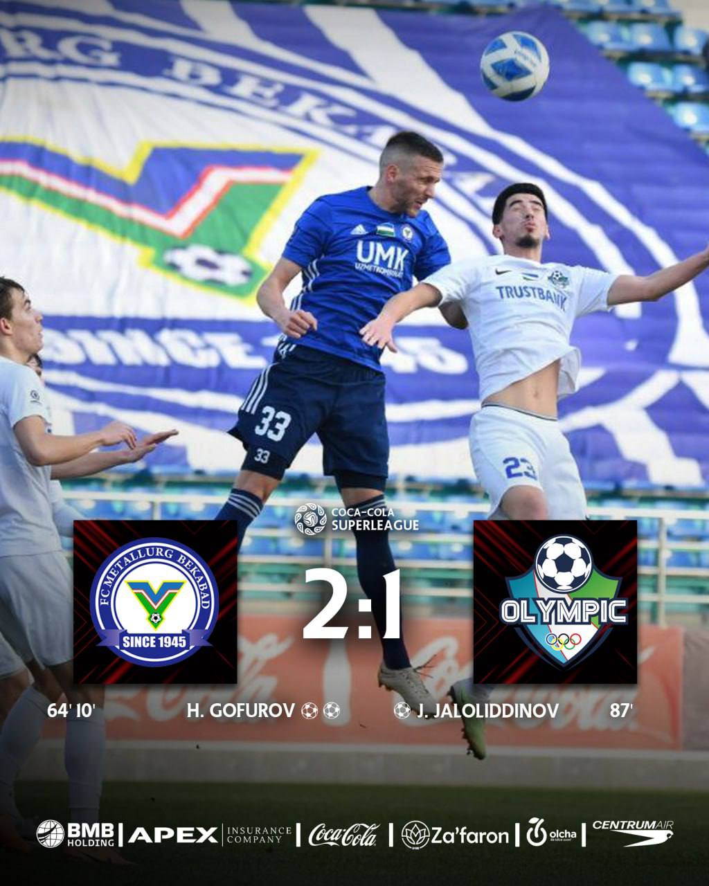 Суперлига Coca-Cola Узбекистана. 26-тур “Металлург” 2 – 1 “Oлимпик” Голы: Х.Гофуров 10’ (1:0), 6...