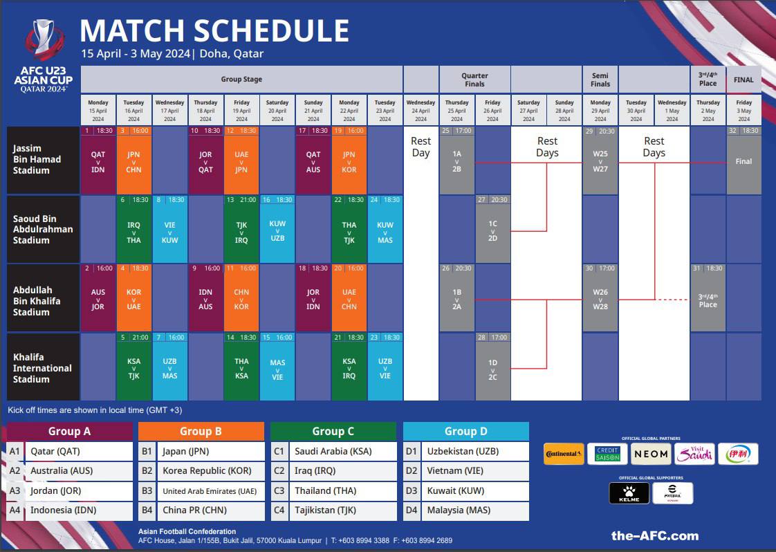 Объявлен календарь матчей Кубка Азии U-23 по футболу, который пройдёт в Катаре с 15 апреля по 3 мая ...