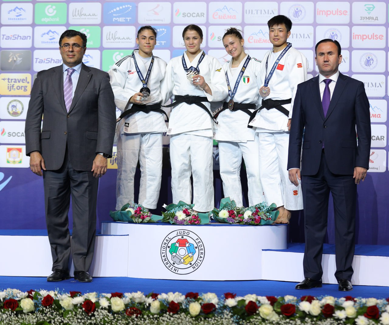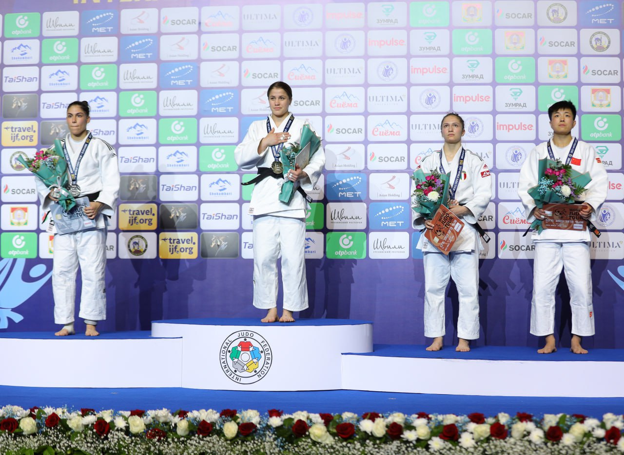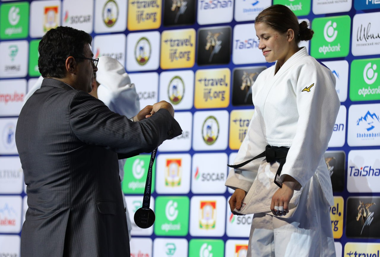 Душанбедаги татамиларда -57 кг вазн тоифасининг маликасига айланган Шукуржон Аминова тақдирлаш маросимида. Чемпионимизга Халқаро дзюдо федерацияси (IJF) Ҳакамлар ҳайъати директори, ҳамюртимиз Армен Багдасаров олтин медални топширди.